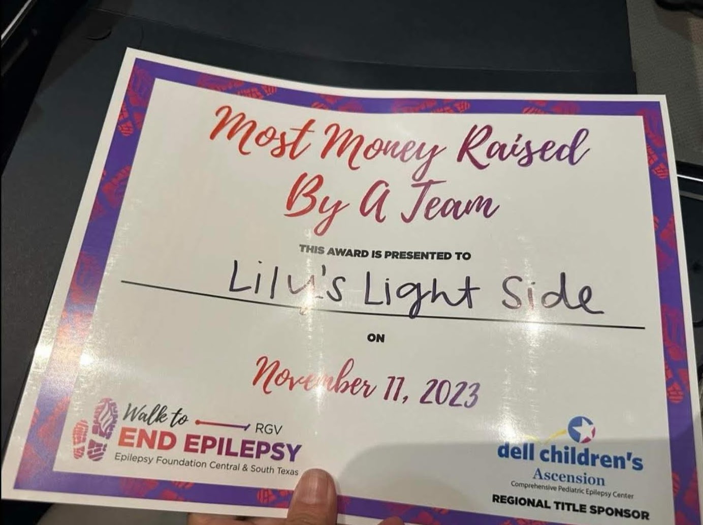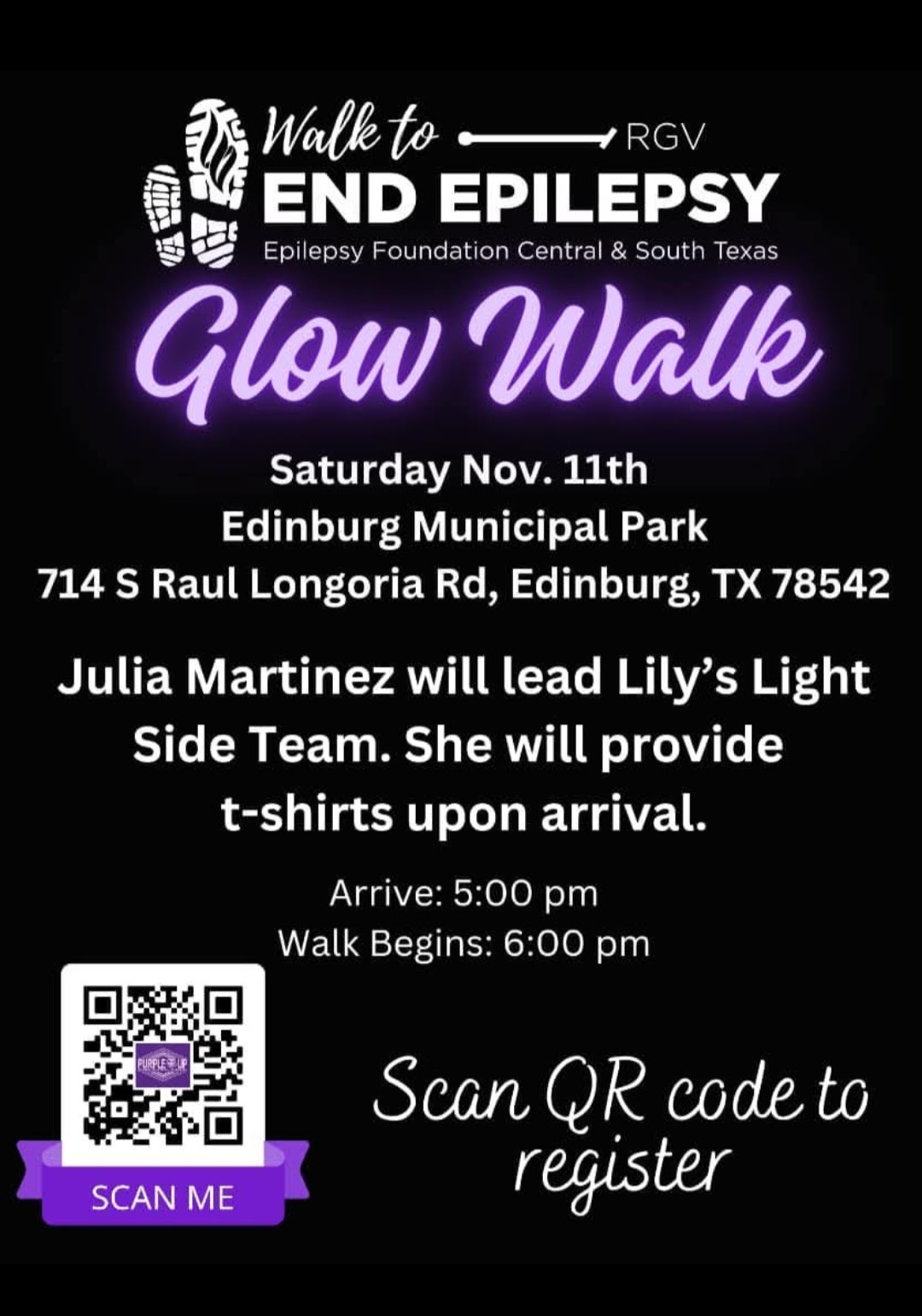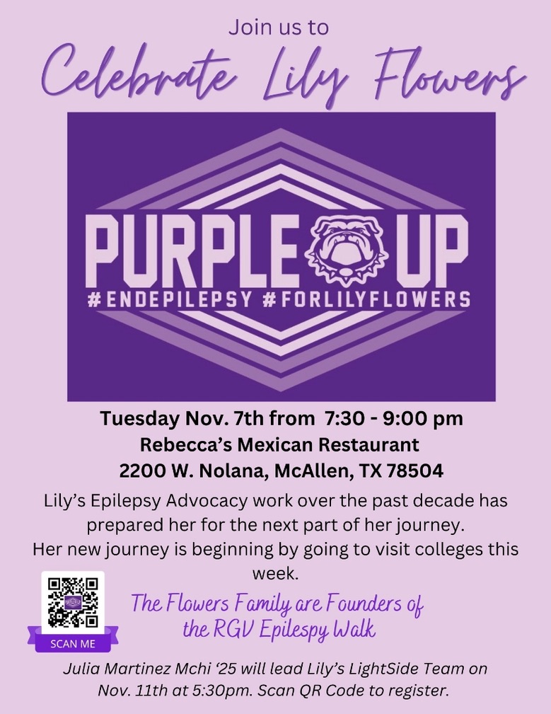 My name is Julia Martinez and when I was in 3rd Grade I was diagnosed with Absence Seizures which is when there is a brief abnormal electrical activity in one’s brain for a short time. Thankfully, I have been in remission for 7 years. Every year on March 26th the Epilepsy Foundation spreads the word to wear purple in support of those who were diagnosed and those who are currently diagnosed with the different forms of epilepsy. In November 2023 I got the opportunity to join Lily Flowers a Class of 2024 graduate from McAllen High School who is diagnosed with epilepsy for over a decade to raise awareness and money. Both her and her family has been raising money to go towards the Epilepsy Foundation to help others diagnosed. During that time I got the chance to organize a team for the annual epilepsy walk hosted here in the RGV in order to help Lily while she was getting ready for her new journey by touring colleges. With the team we put together we got recognized as the top fundraiser in the RGV at the Walk to End Epilepsy Glow Walk hosted by the Epilepsy Foundation Central & South Texas. Here are some pictures from the kickoff event and walk.